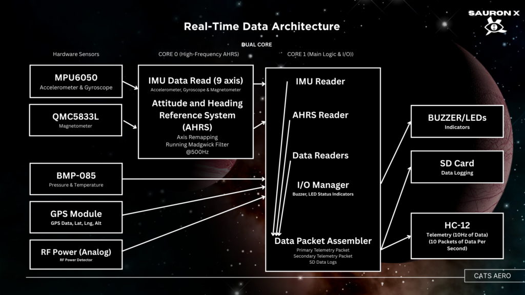 I developed an unsynchronized data acquisition algorithm that captures sensor data without blocking buffer memory, enabling faster update rates and freeing compute resources for SD card operations, Madgwick-based attitude estimation, and telemetry.